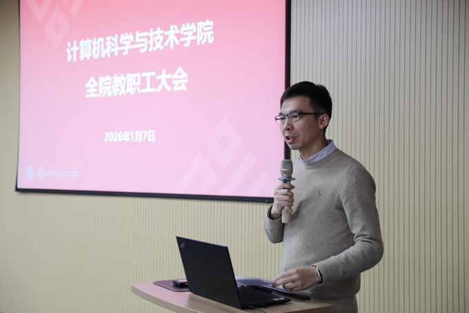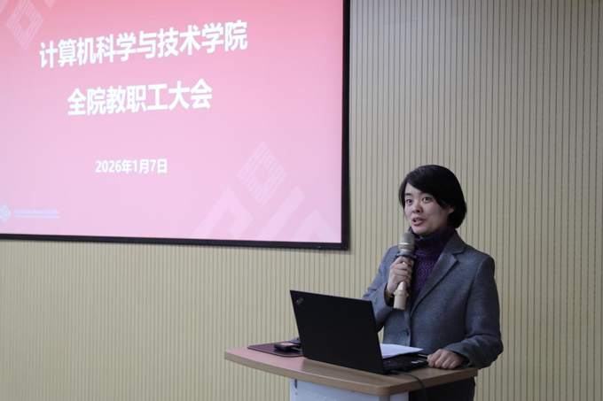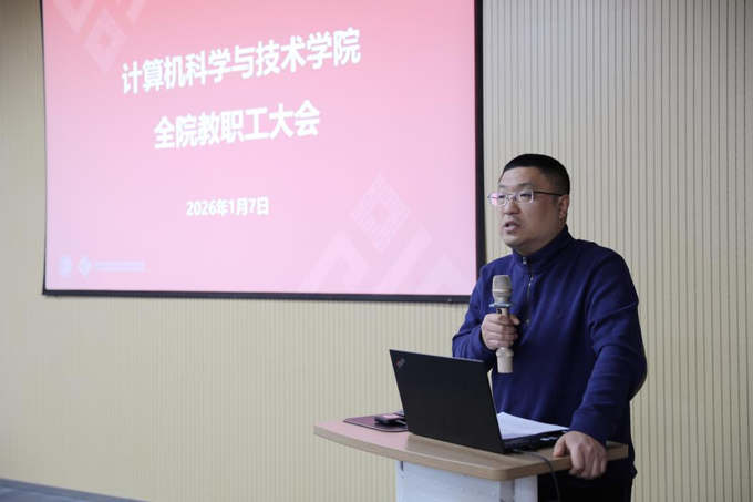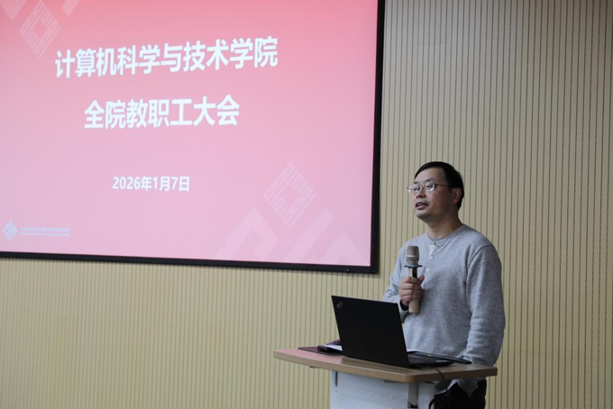 2026年1月8日下午,计算机科学与技术学院在理科大楼B112召开2026年首次全院教职工大会。学院全体教职工与学生代表参加会议,会议由学院党委书记余佳主持。