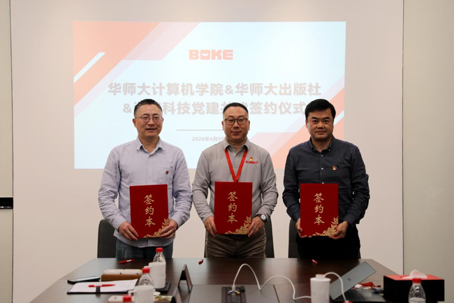为深入推进科技创新与产业创新深度融合,一体推进教育、科技、人才协同发展,助力“游戏+”产业生态建设,4月9日下午,计算机学院与波克科技集团、华东师范大学出版社举行党建共建签约仪式,旨在以党建引领推动双方业务深度融合。波克科技集团党委书记刘忠生、华东师范大学出版社党委书记王健、计算机学院党委书记余佳代表各方签订共建协议。信息学部主任兼计算机学院党委副书记、院长张桂戌,波克教育业务总监陈苏,出版社党委副书记兼纪委书记李海生,计算机学院党委副书记徐世猛以及来自三方的相关人员出席签约仪式。