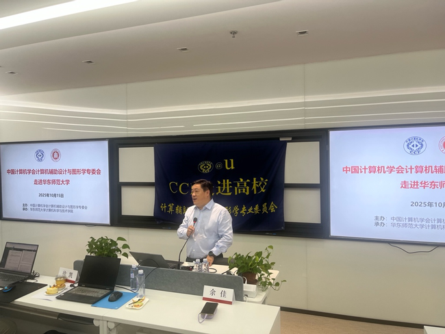 2025年10月15日下午,中国计算机学会计算机辅助设计与图形学专委会(CCF CAD&CG)主办、华东师范大学计算机科学与技术学院承办的“CCF CAD&CG专委会走进华东师范大学”活动在普陀校区理科大楼成功举办。本次活动吸引了来自华东师范大学、上海交通大学、上海师范大学等单位100余名听众现场参会。